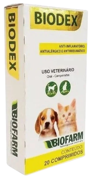 BIODEX comprimido é indicado para cães e gatos como anti-inflamatório, antialérgico e antirreumático nas afecções tais como: dermatites inespecíficas, tendinites, artrites, reumatismos articulares e musculares, gonites, paresia posterior e complicações inflamatórias decorrentes de afecções traumáticas.